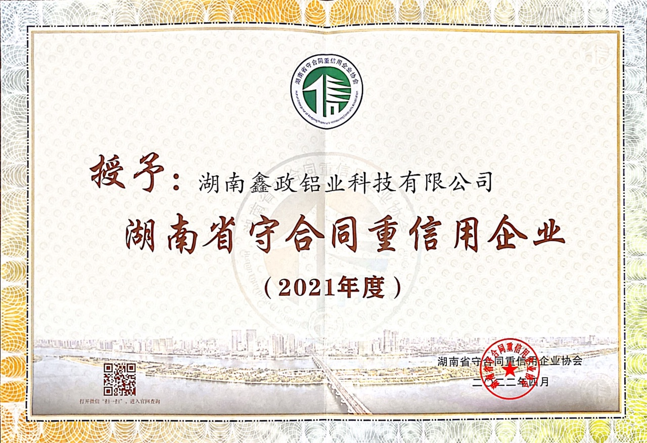 此次獲評湖南省“守合同重信用企業”這一省級榮譽,不僅體現了政府、行業、客戶及社會大眾對鑫政鋁業誠信經營、守則履約的高度肯定,也彰顯了企業高質高效服務客戶的決心和實力。公司將進一步弘揚守合同重信用精神,在創造經濟效益的同時,注重企業品牌建設,積極履行社會責任,為社會創造更多價值。
